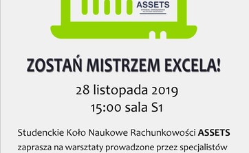 Nasze Koło Naukowe Rachunkowości ASSETS organizuje warsztaty z Excela. Warsztaty te zostaną przeprowadzone przez ekspertów z firmy Deloitte. Warsztaty odbędą się 28 listopada 2019 r. w sali S-1.